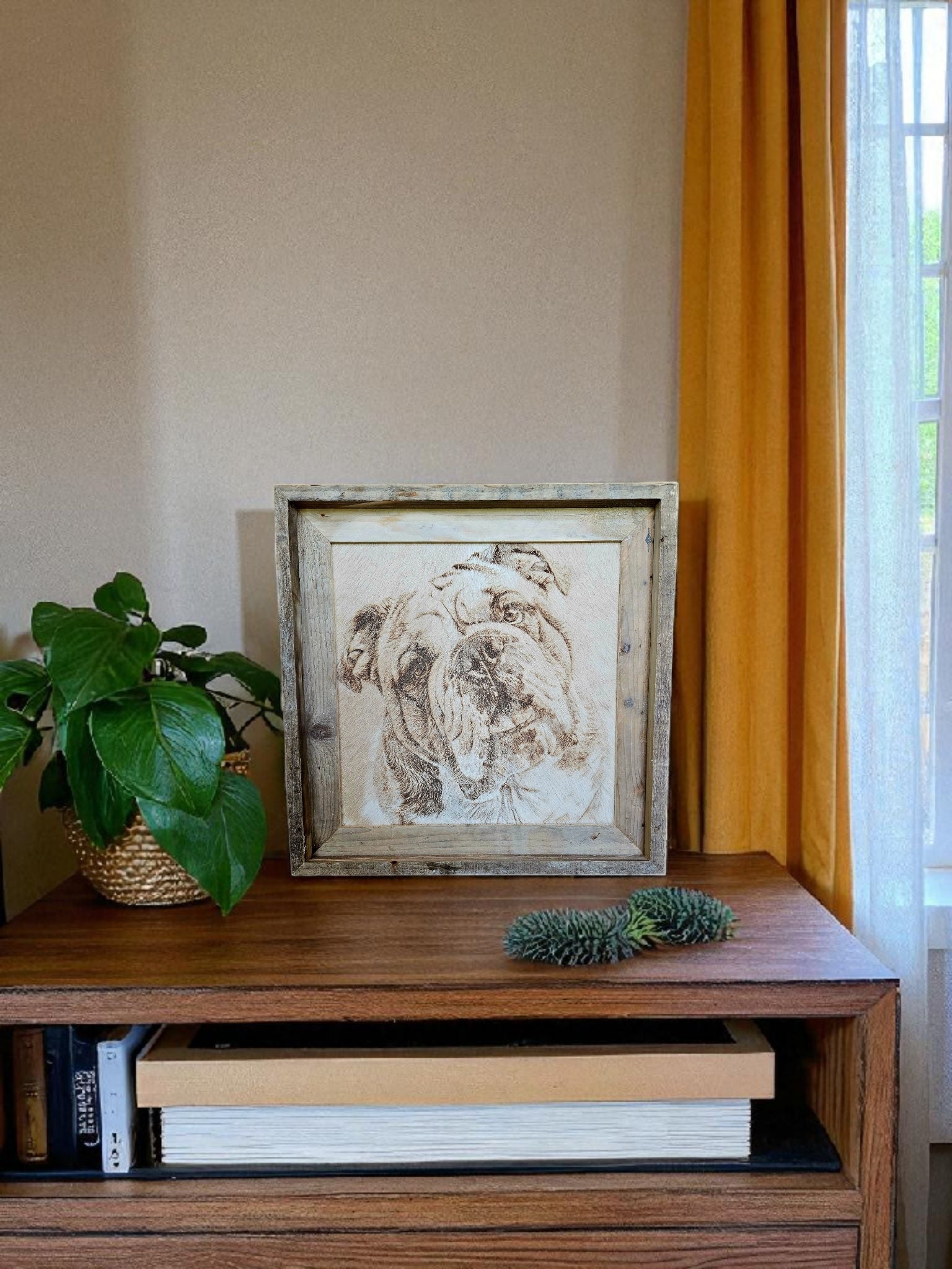 "This striking piece features a bold bulldog portrait skillfully printed on genuine cowhide, creating a rugged texture that enhances the dog’s powerful stance and expressive face. The image is set within a handcrafted rustic wooden frame, adding warmth and vintage charm. Perfect for farmhouse, lodge, or Western-inspired décor, it combines timeless craftsmanship with a touch of canine character."