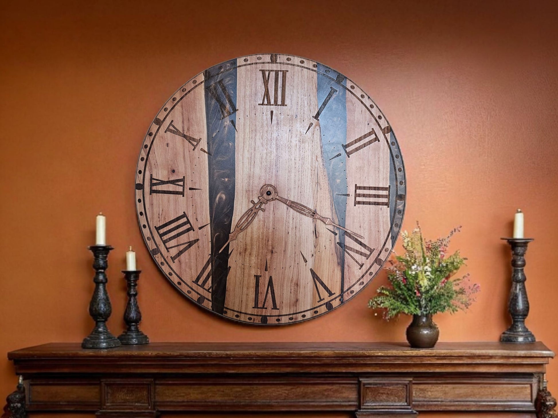 Rich, warm, and full of character, this Pecan Wood and Chocolate Epoxy Clock combines natural beauty with refined craftsmanship. Measuring 18 inches in diameter, it features a stunning slab of pecan wood, prized for its intricate grain patterns and golden-brown tones.