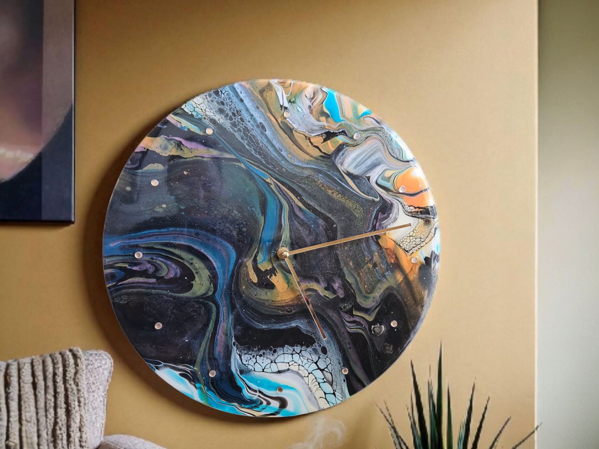 Each clock is handcrafted with high-quality epoxy, giving it a glossy, glass-like finish that enhances the depth and vibrancy of the design. Subtle dot markers and sleek golden hands keep the look clean and modern, while ensuring easy time-telling.