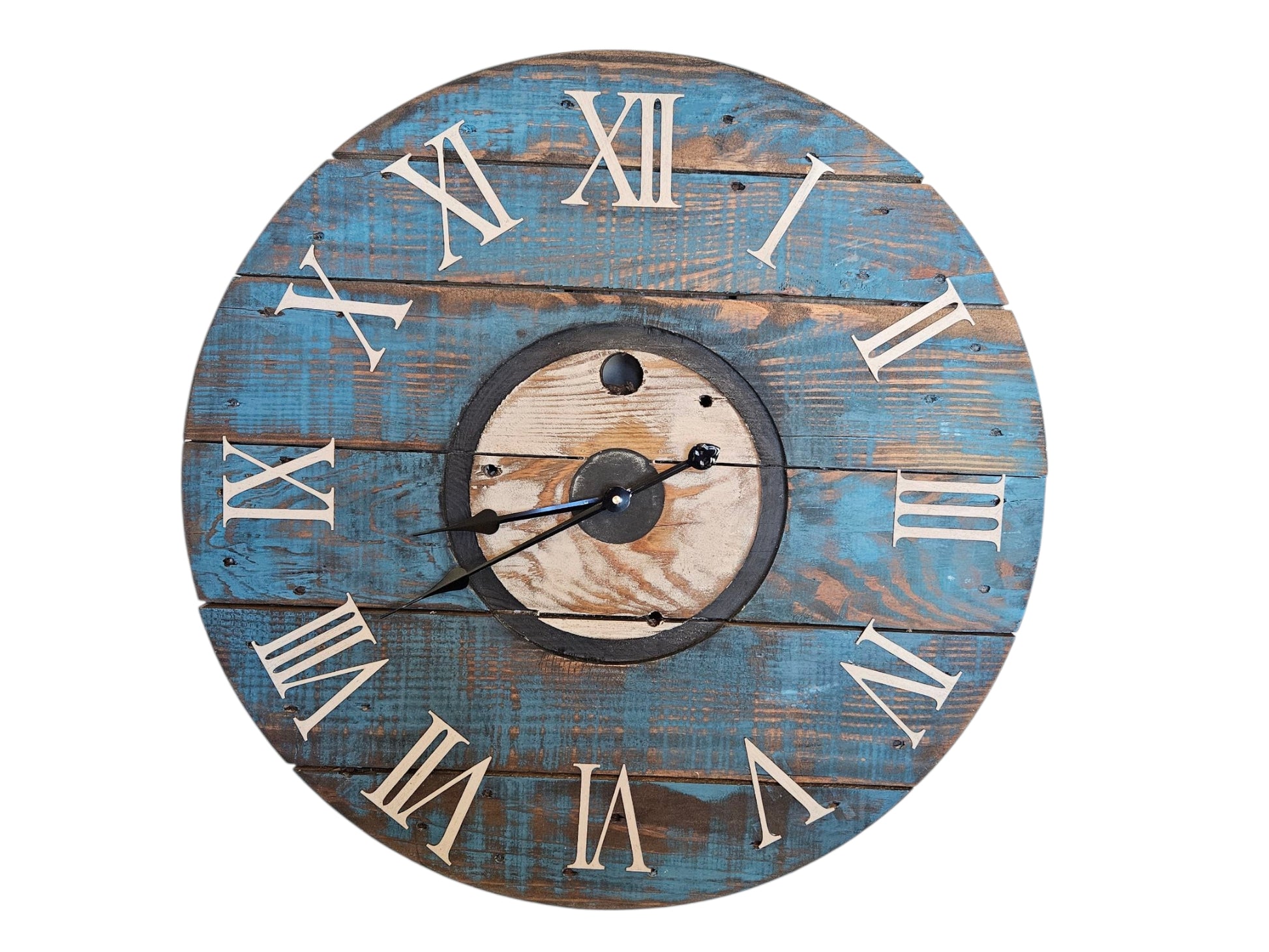 Each clock is one-of-a-kind, with unique wood patterns and finish details, making it not just a timepiece but a work of art. The Rustic Blue Wire Spool Clock blends vintage appeal with farmhouse elegance—perfect for anyone who loves décor that tells a story.