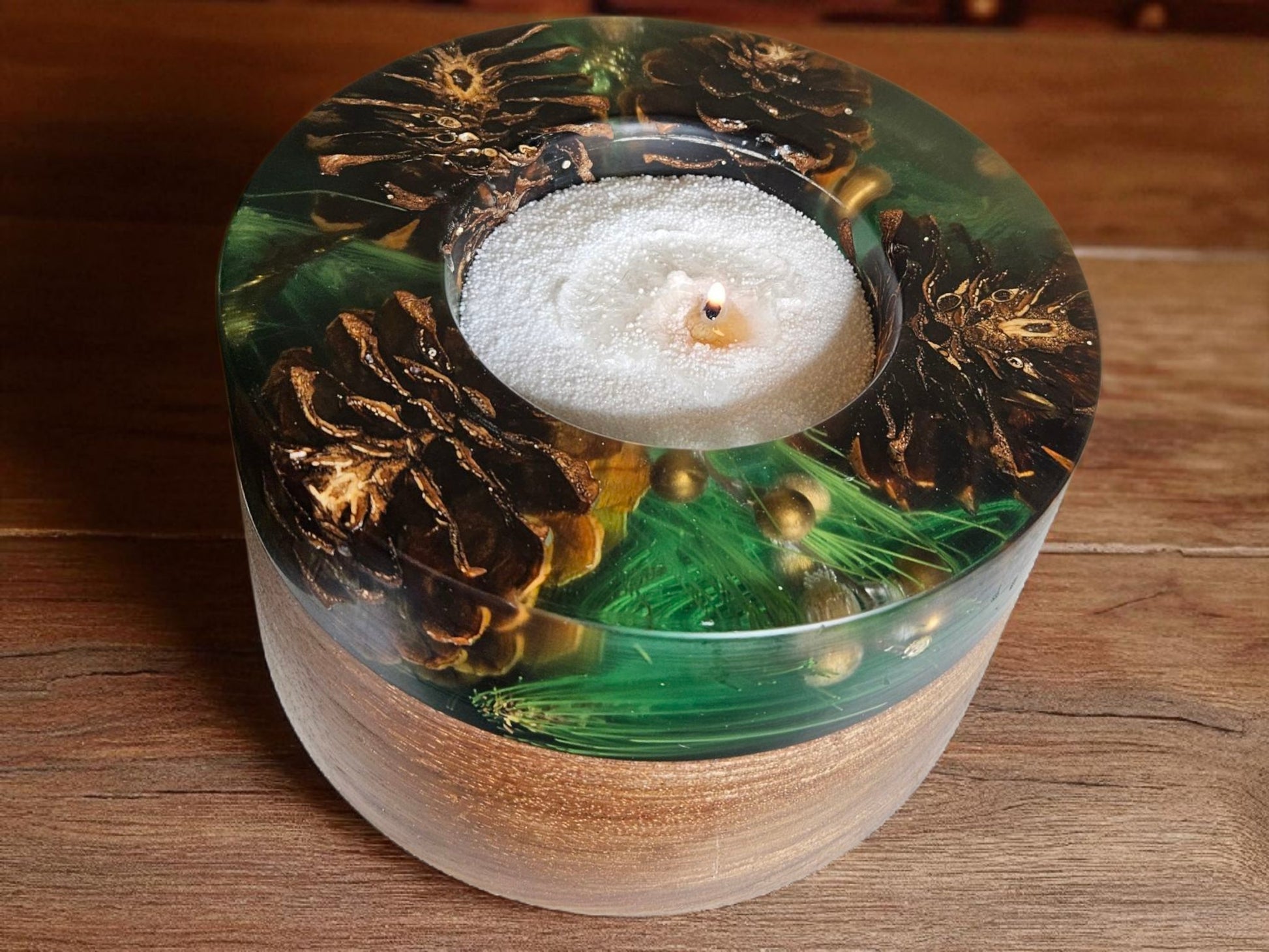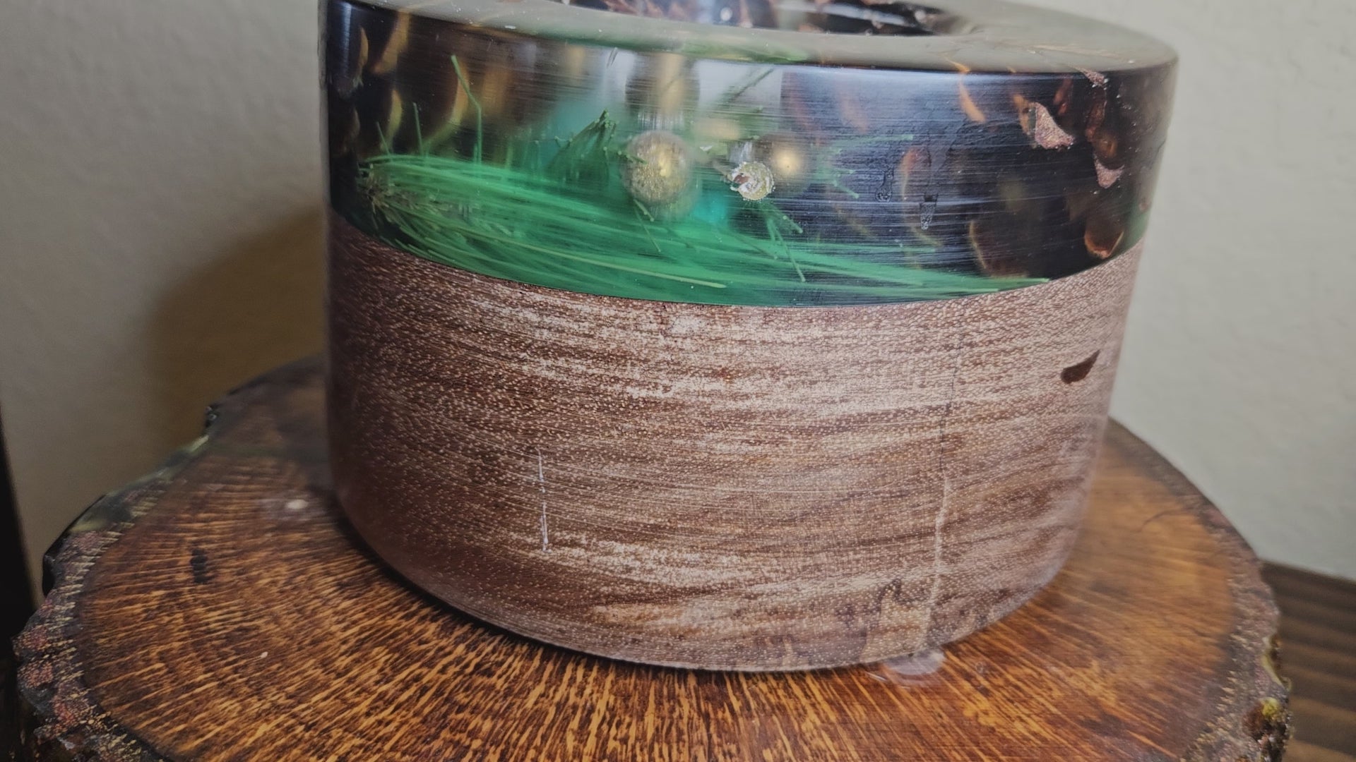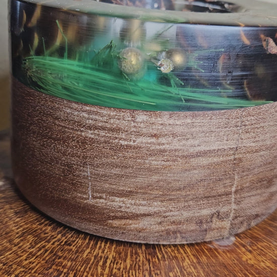 This stunning handcrafted bowl blends the natural warmth of walnut with the enchanting beauty of crystal-clear green epoxy. Encased within the resin are real pinecones and pine needles, preserved to capture the essence of the forest. The rich walnut base adds depth and balance, while the translucent green epoxy brings a sense of nature’s serenity and timeless charm.