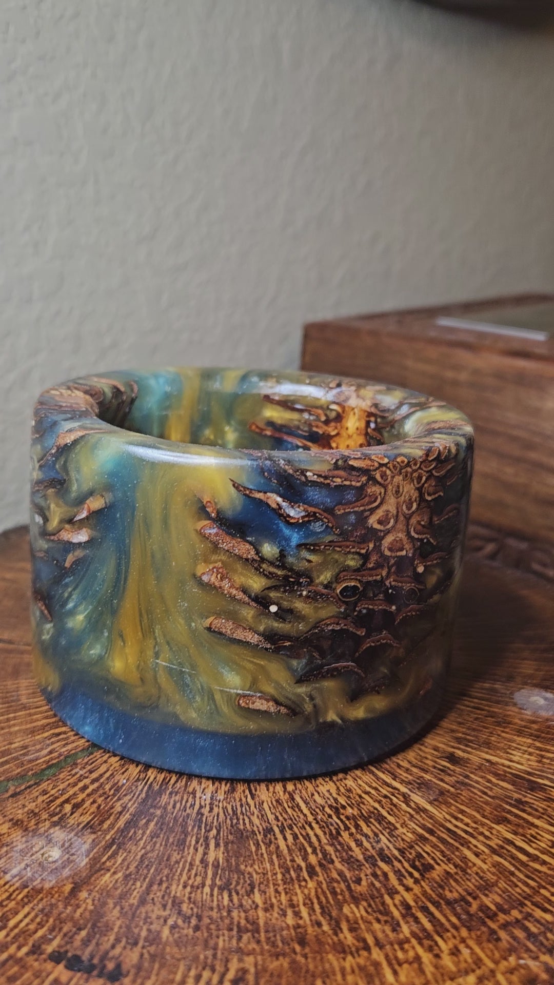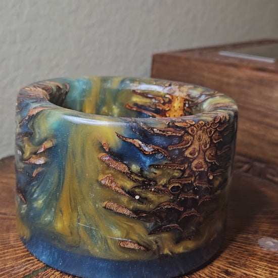 This enchanting candle holder blends the rustic charm of natural pinecones with the luminous beauty of swirling green and golden-yellow epoxy. The organic textures of the pinecones create depth and warmth, while the shimmering resin accents capture light beautifully, evoking the glow of a forest kissed by sunlight.