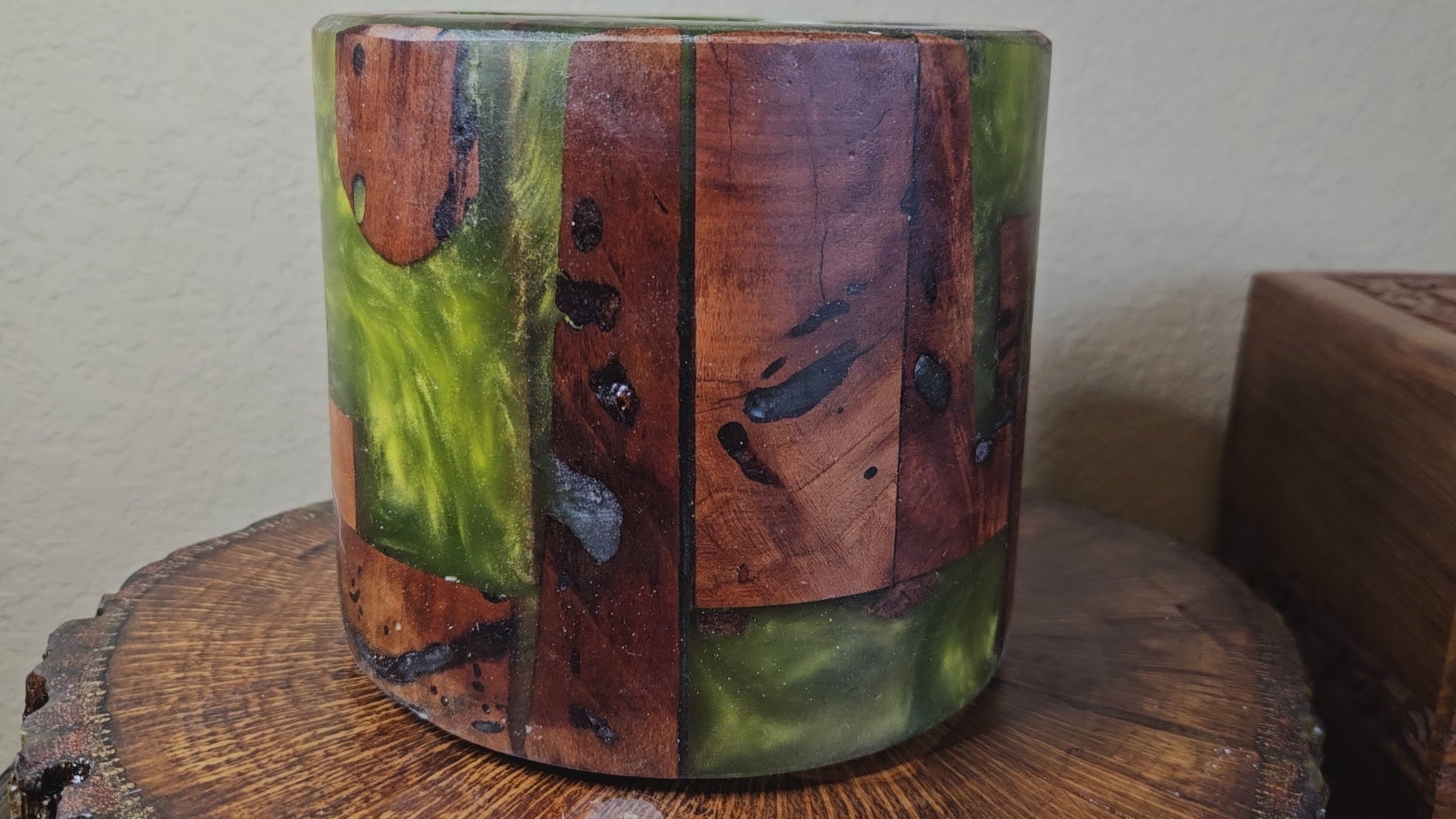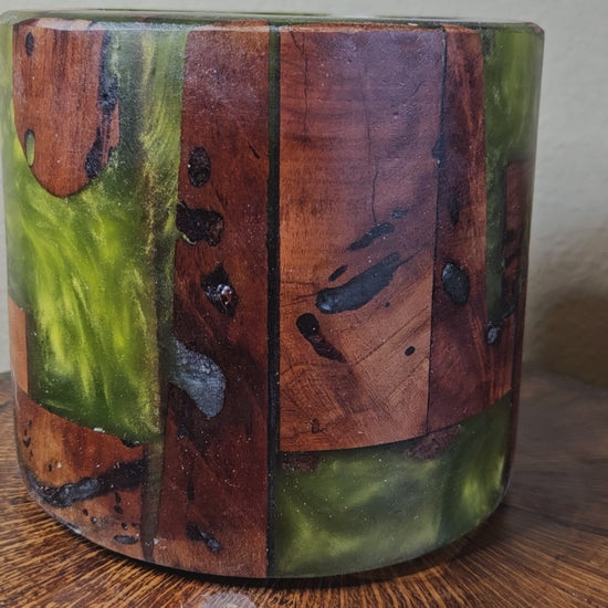This striking handcrafted bowl beautifully combines the warmth of natural cherry wood with the rich, shimmering depth of green resin. Measuring 6 inches wide by 5 inches tall, it features a patchwork design that highlights the character of the cherry wood’s grain, enhanced by unique inclusions and natural markings. The glossy green resin adds contrast and elegance, making this piece both rustic and contemporary.