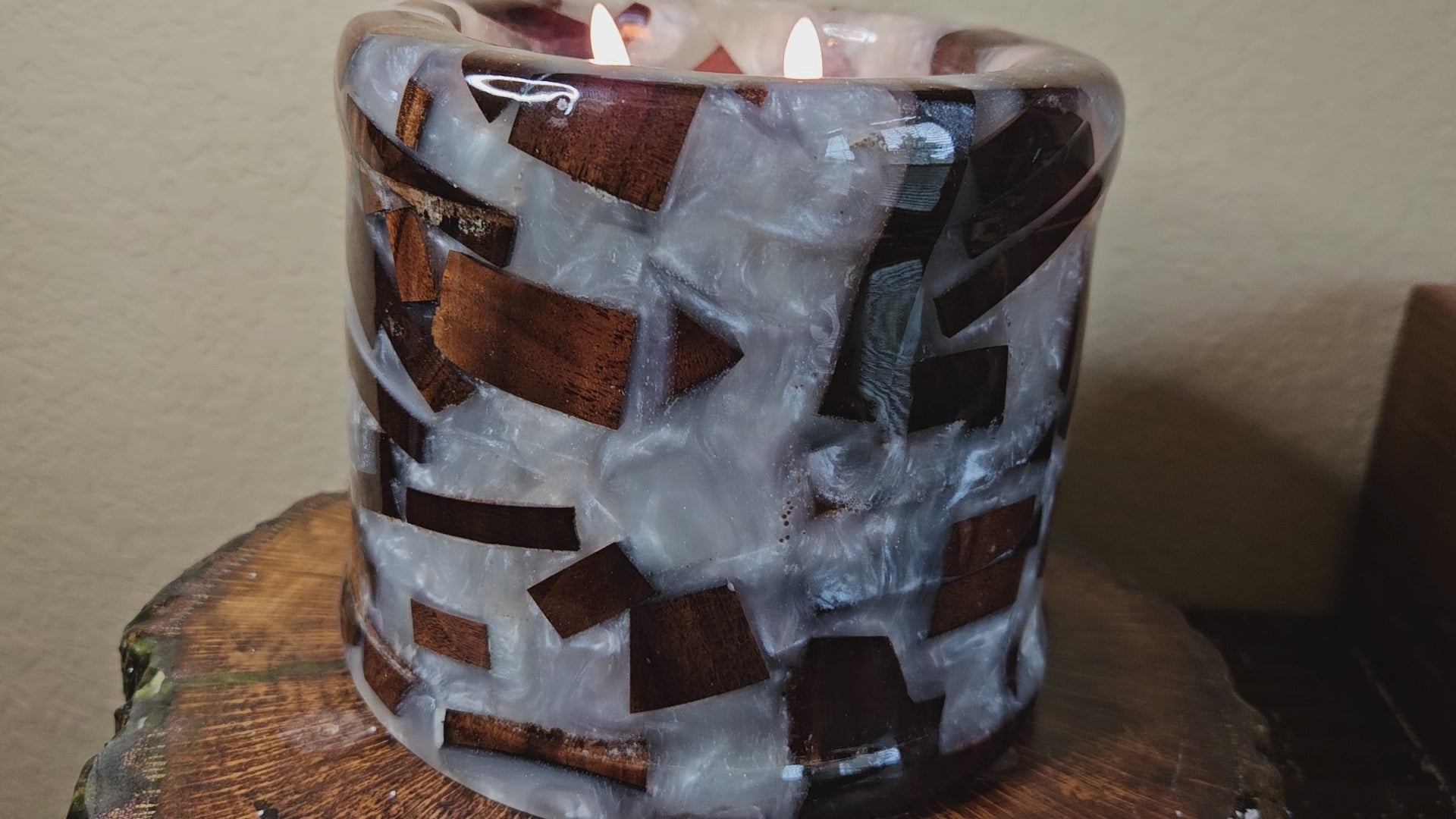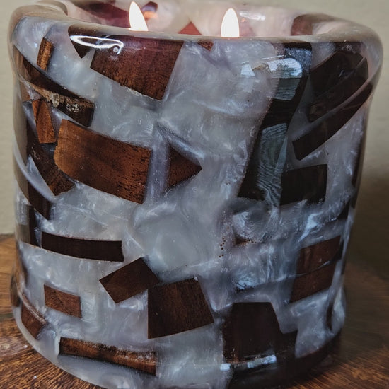This stunning handcrafted bowl blends the natural richness of walnut wood with the modern elegance of pearlescent white epoxy. Measuring 6 inches wide by 6 inches tall, it features a striking mosaic design where warm walnut tones contrast beautifully with the luminous depth of the epoxy. The high-gloss finish highlights the textures and patterns, making each piece a one-of-a-kind work of art.
