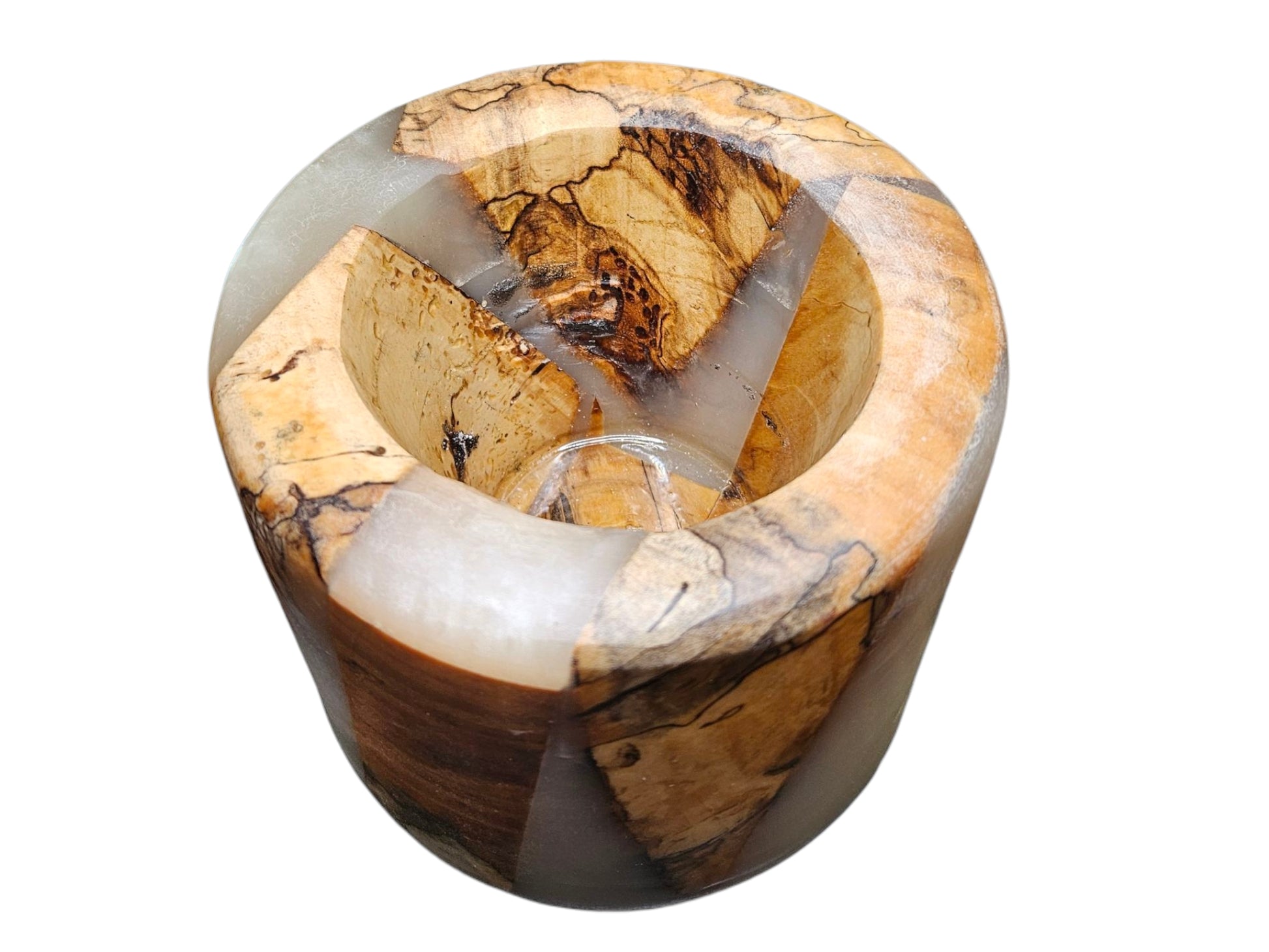 This elegant, handcrafted dish highlights the natural beauty of splatted maple, seamlessly paired with smooth, creamy epoxy. The striking veining of the maple wood contrasts beautifully with the soft translucence of the epoxy, creating a piece that feels both organic and modern. Its polished finish enhances the wood’s unique patterns while offering a durable, functional surface.