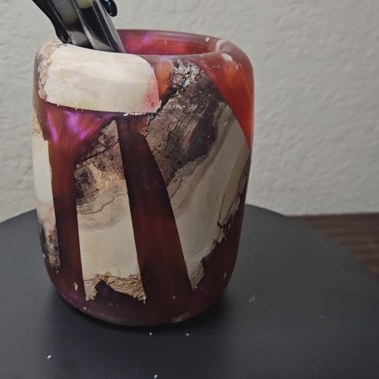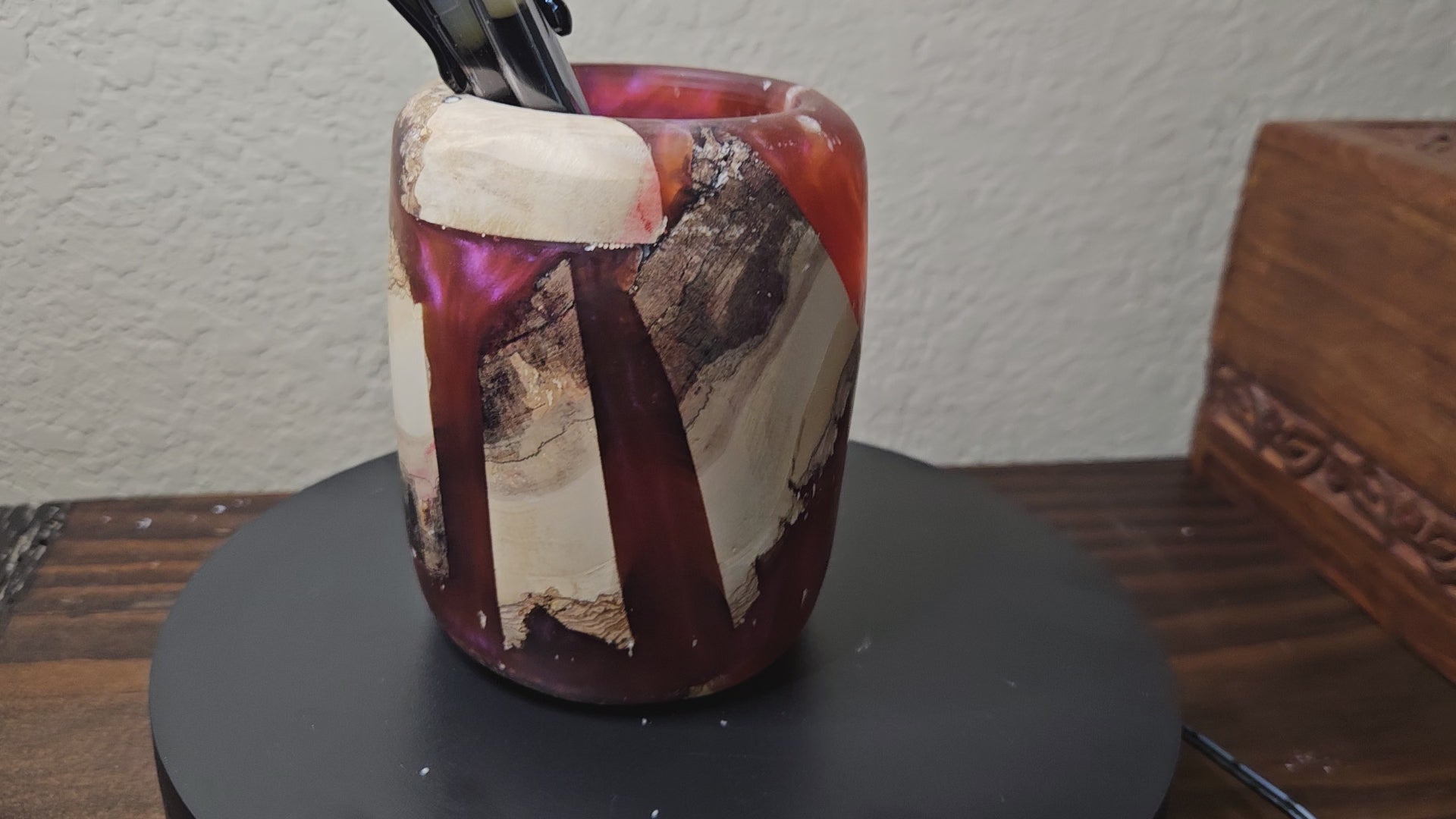 This striking handcrafted dish combines the natural character of flaming box elder with the bold vibrancy of deep red epoxy. The swirling wood grain and natural inclusions are beautifully preserved, while the translucent resin adds a dramatic contrast that highlights the organic textures. Its smooth, polished finish enhances both the warmth of the wood and the richness of the epoxy.