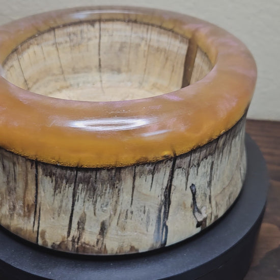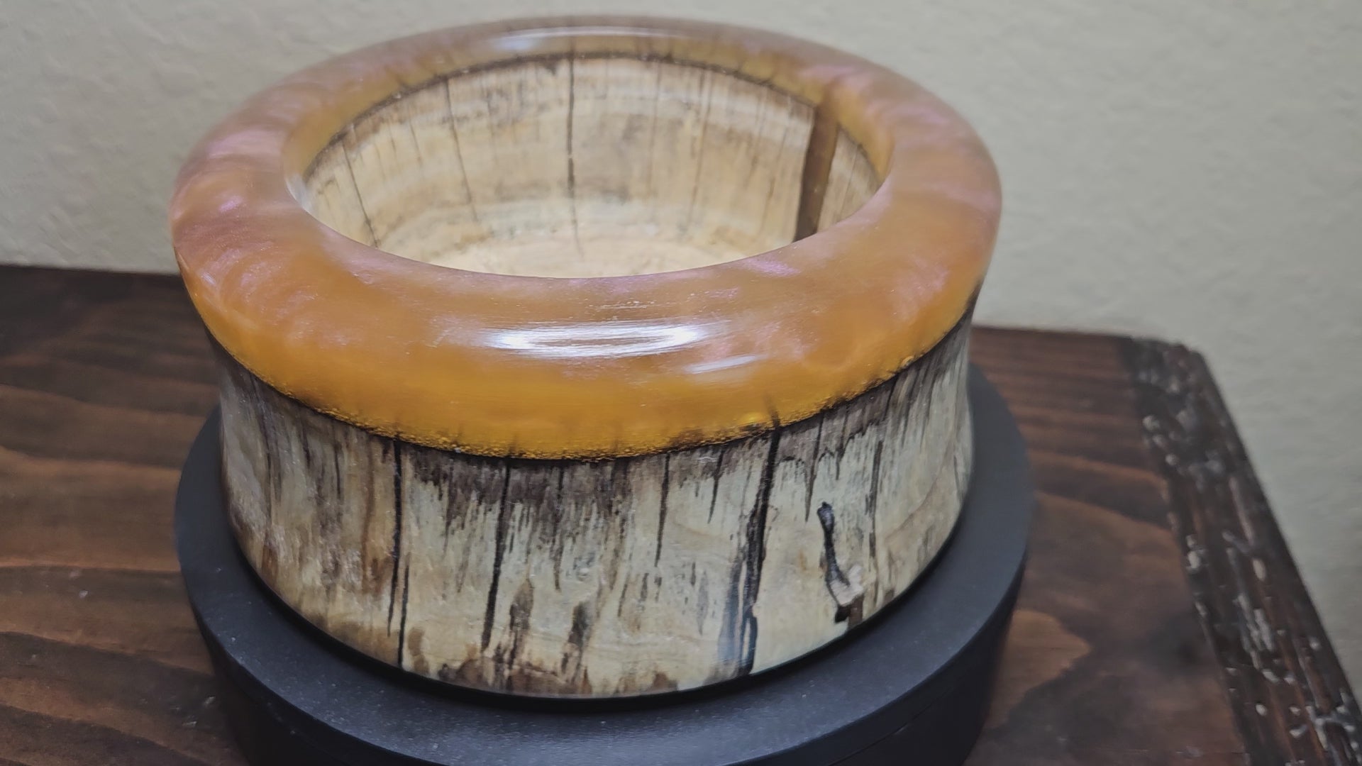 This Maple and Gold Dish is a striking fusion of rustic charm and modern elegance. Hand-turned from richly grained maple wood, the dish is accented with shimmering gold epoxy that enhances the natural beauty of the wood while adding a touch of luxury. Its smooth, glossy finish brings out the character in the maple’s grain, making each piece a true one-of-a-kind work of art.