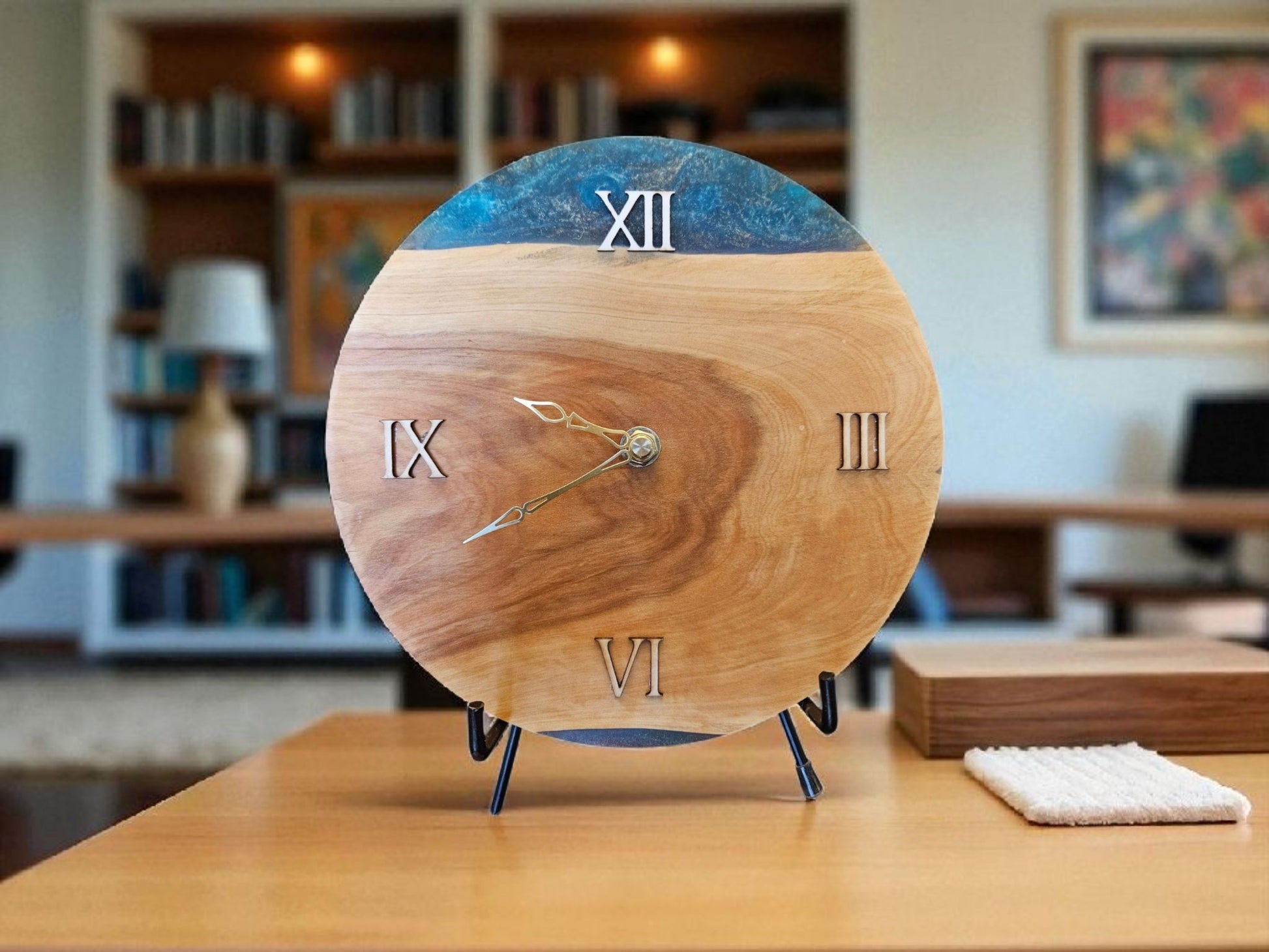 Compact yet eye-catching, this clock is the perfect size for desks, shelves, or small wall spaces. The unique combination of wood and epoxy ensures no two pieces are ever alike, making it a functional work of art that enhances any room with character and style.