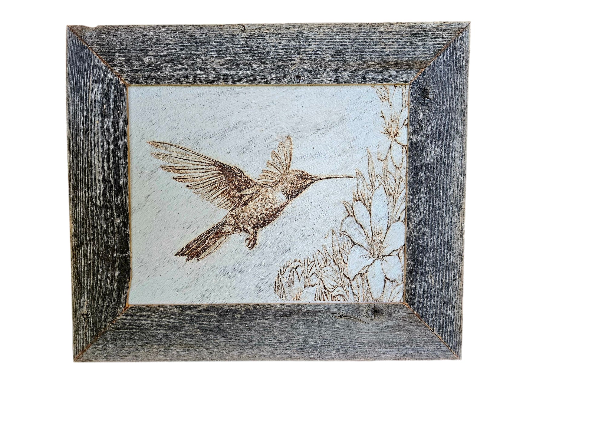 The cowhide canvas brings a rich, organic texture to the scene. Its natural variations in tone and grain make the engraving feel alive, almost like the hummingbird is hovering over a real landscape. The laser work blends seamlessly with the hide’s surface, creating a warm, sepia-toned effect.