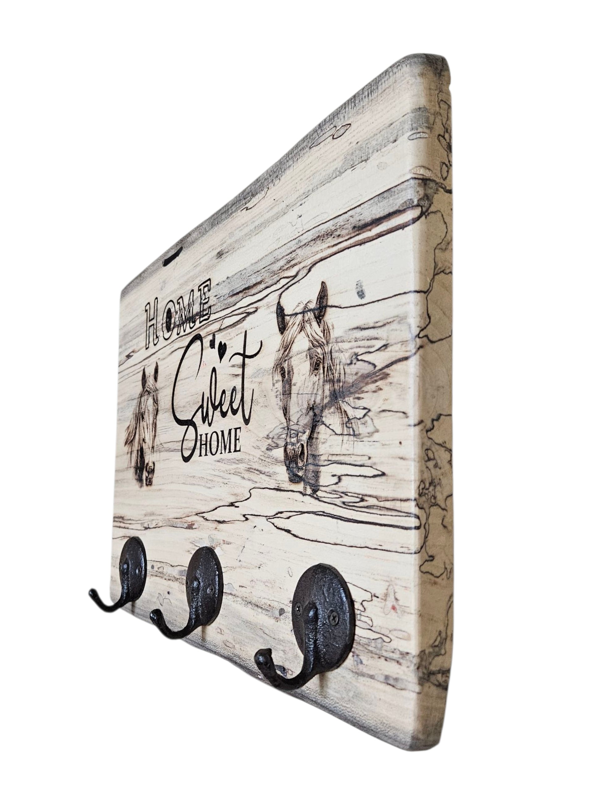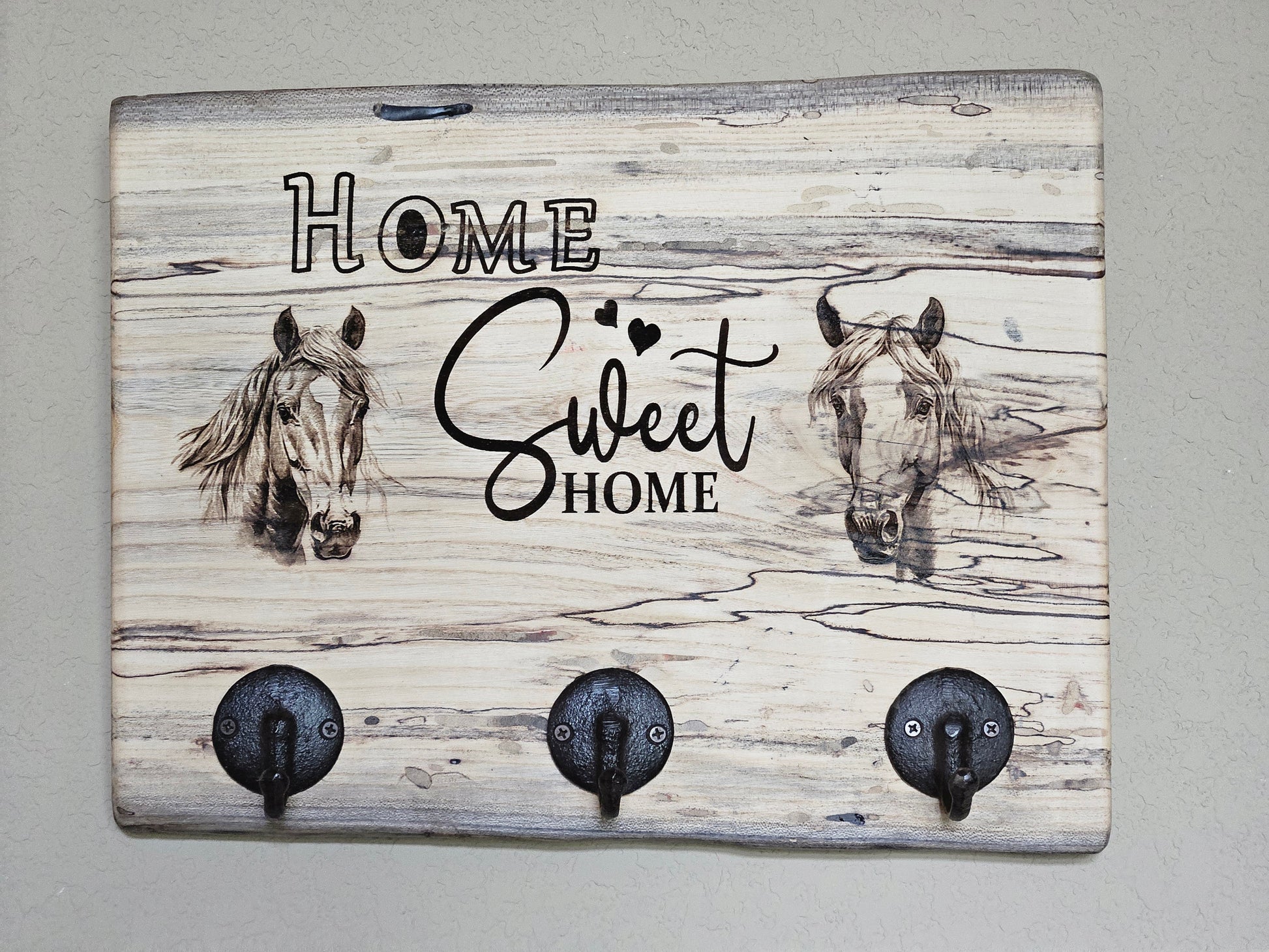 Bring rustic charm and functionality into your entryway with this handcrafted Hackberry wood key and coat rack. Featuring a naturally unique grain pattern, the piece is beautifully engraved with two detailed horse illustrations and the heartfelt phrase “Home Sweet Home” in a mix of bold and script fonts.