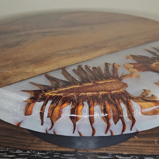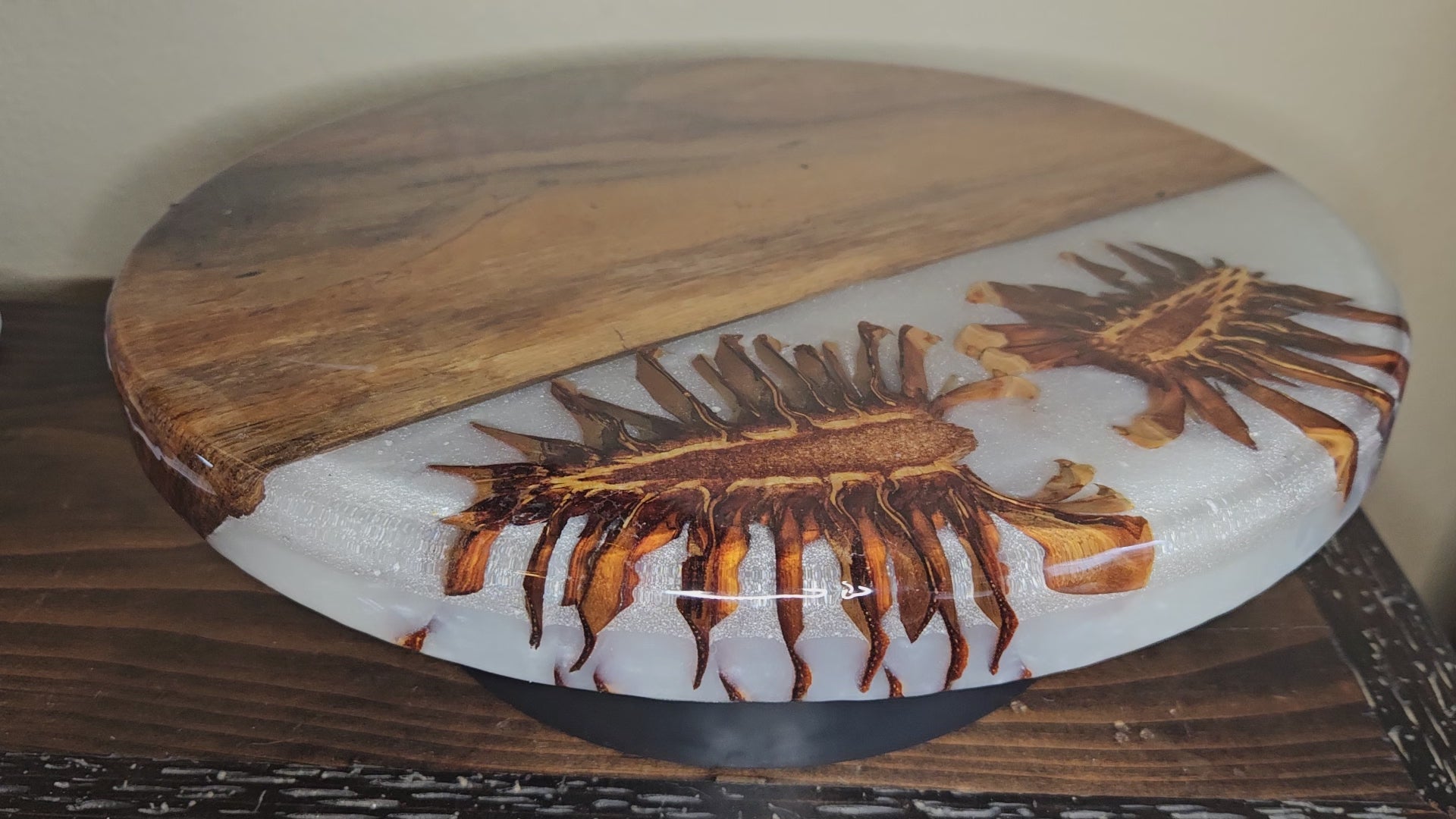 This one-of-a-kind Lazy Susan combines the rich warmth of natural pecan wood with the unique beauty of preserved pinecones, set in a smooth white epoxy background. The swirling grain of the pecan contrasts beautifully with the organic patterns of the pinecones, creating a striking yet earthy centerpiece. Perfect for serving meals, displaying appetizers, or adding a touch of rustic elegance to your dining table, this piece blends functionality with art. Handcrafted and finished to a glossy shine, it’s both durable and eye-catching—an heirloom-worthy addition to any home.