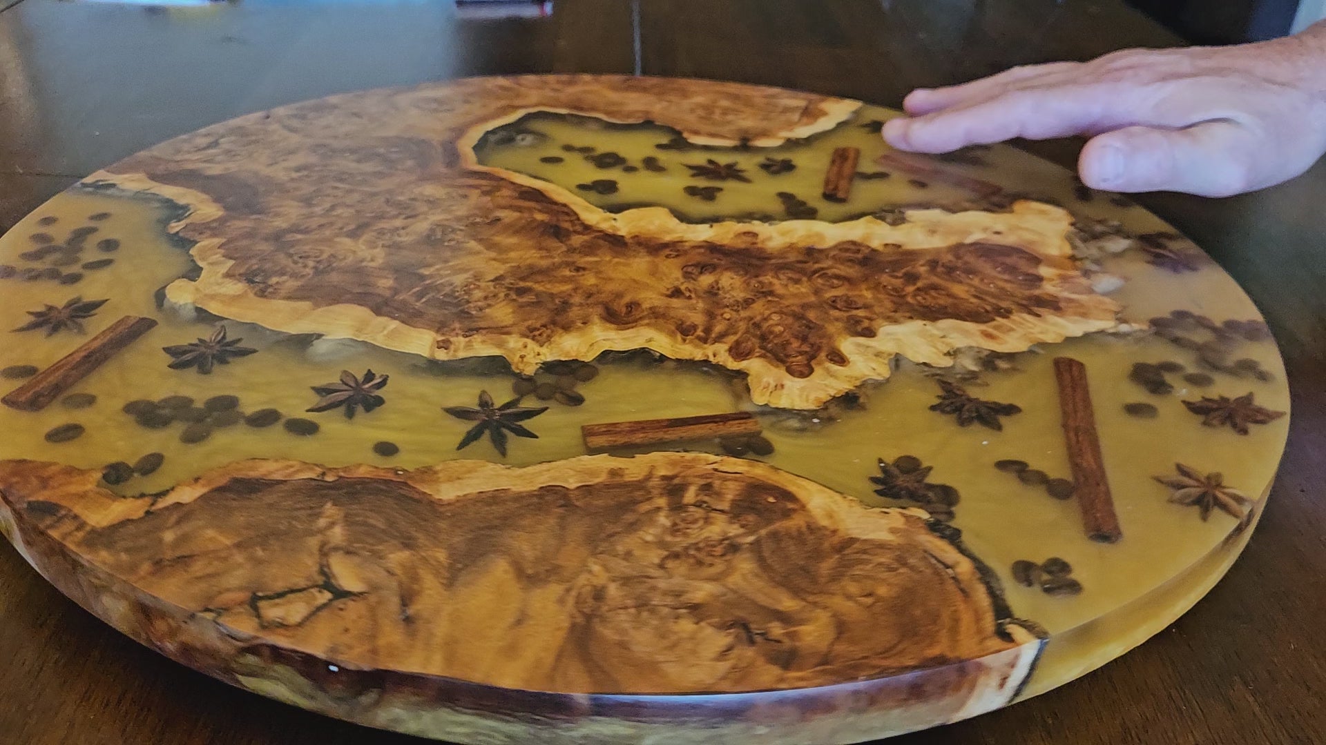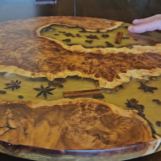 Add a touch of natural artistry to your dining and entertaining with this 19-inch Amboyna Burl Lazy Susan. Handcrafted from exquisite amboyna wood, its intricate grain patterns are beautifully highlighted and paired with warm epoxy tones. Embedded with natural accents like cinnamon sticks, star anise, and coffee beans, this piece creates a stunning blend of rustic charm and modern elegance.