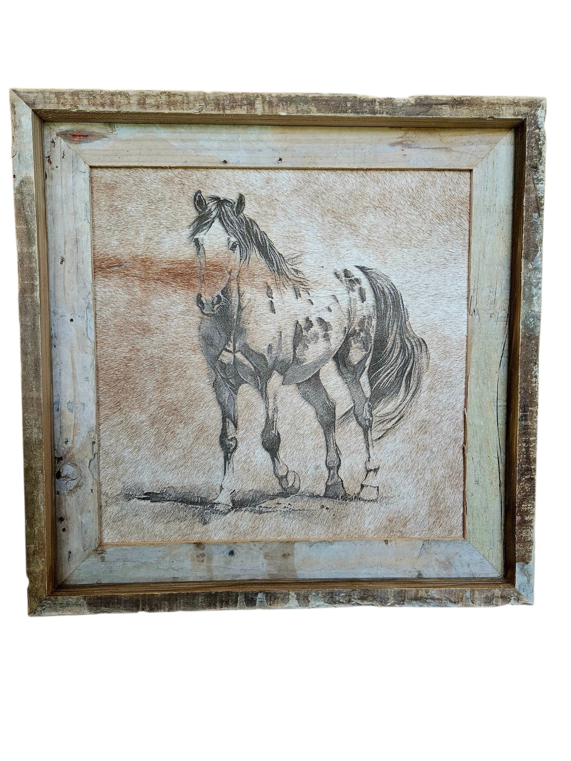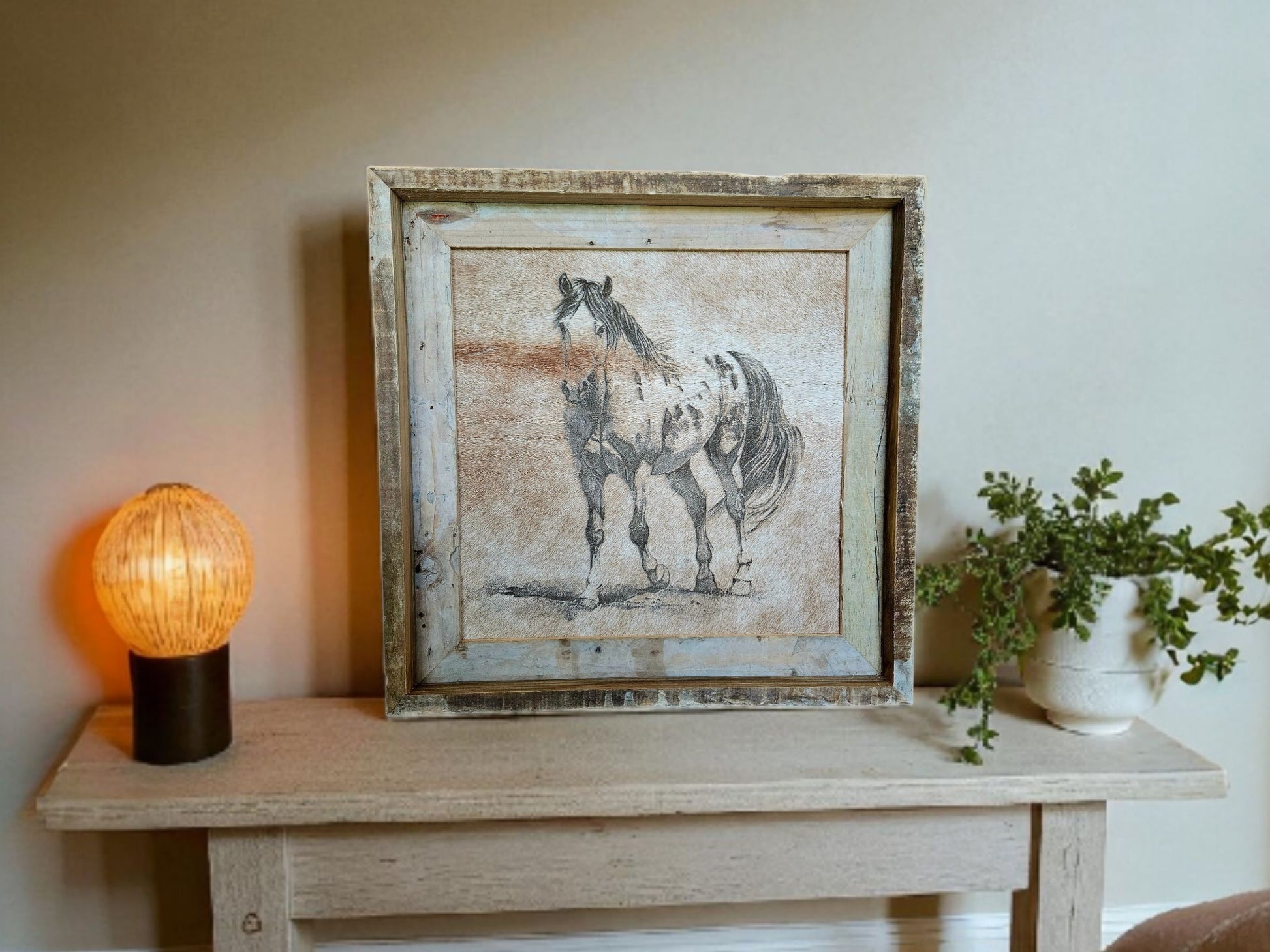 This captivating artwork captures the raw power and grace of a majestic horse, its noble stance and lifelike detail evoking a sense of freedom and strength. Set within a rich barnwood frame, the piece gains warmth and depth, the natural wood tones perfectly complementing the horse’s form.