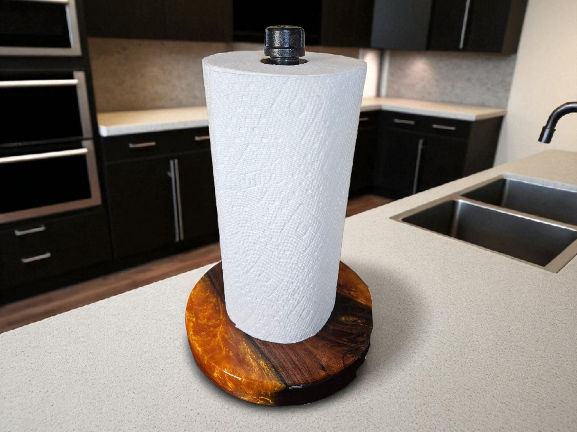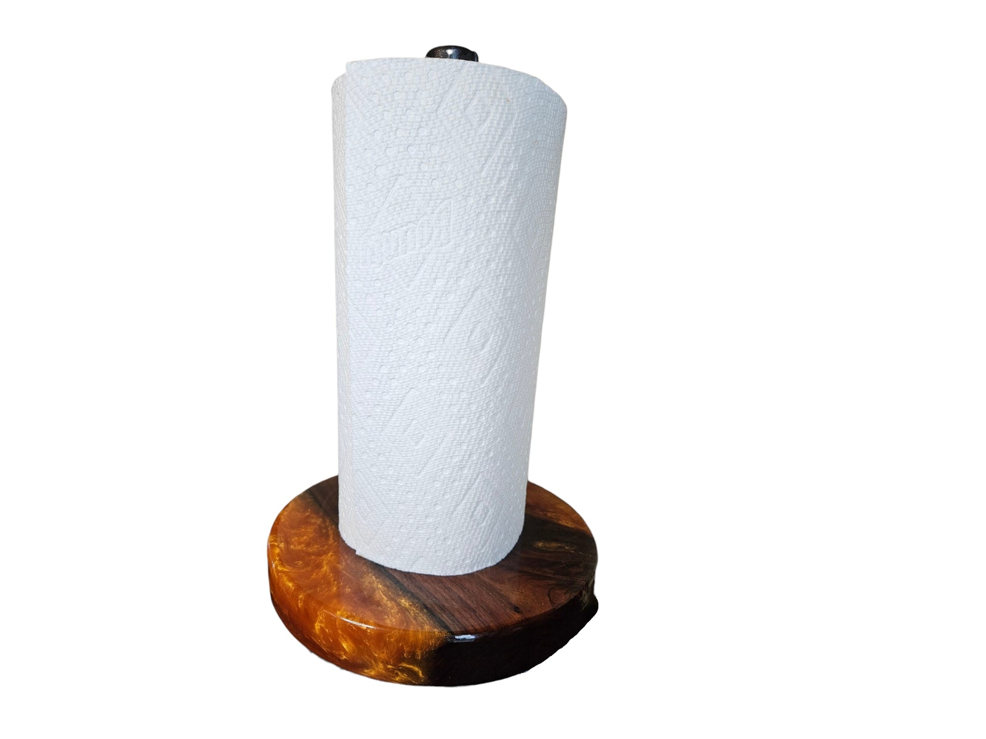 Bring both function and artistry into your kitchen with this handcrafted paper towel holder. The sturdy base is crafted from rich pecan wood paired with shimmering golden copper epoxy, creating a warm and eye-catching contrast. Each piece highlights the natural beauty of the wood grain enhanced by the metallic resin’s glow, making it not just a kitchen essential but also a decorative accent. Durable and practical with a modern rustic charm, this paper towel holder is perfect for adding a touch of elegance to everyday use.
