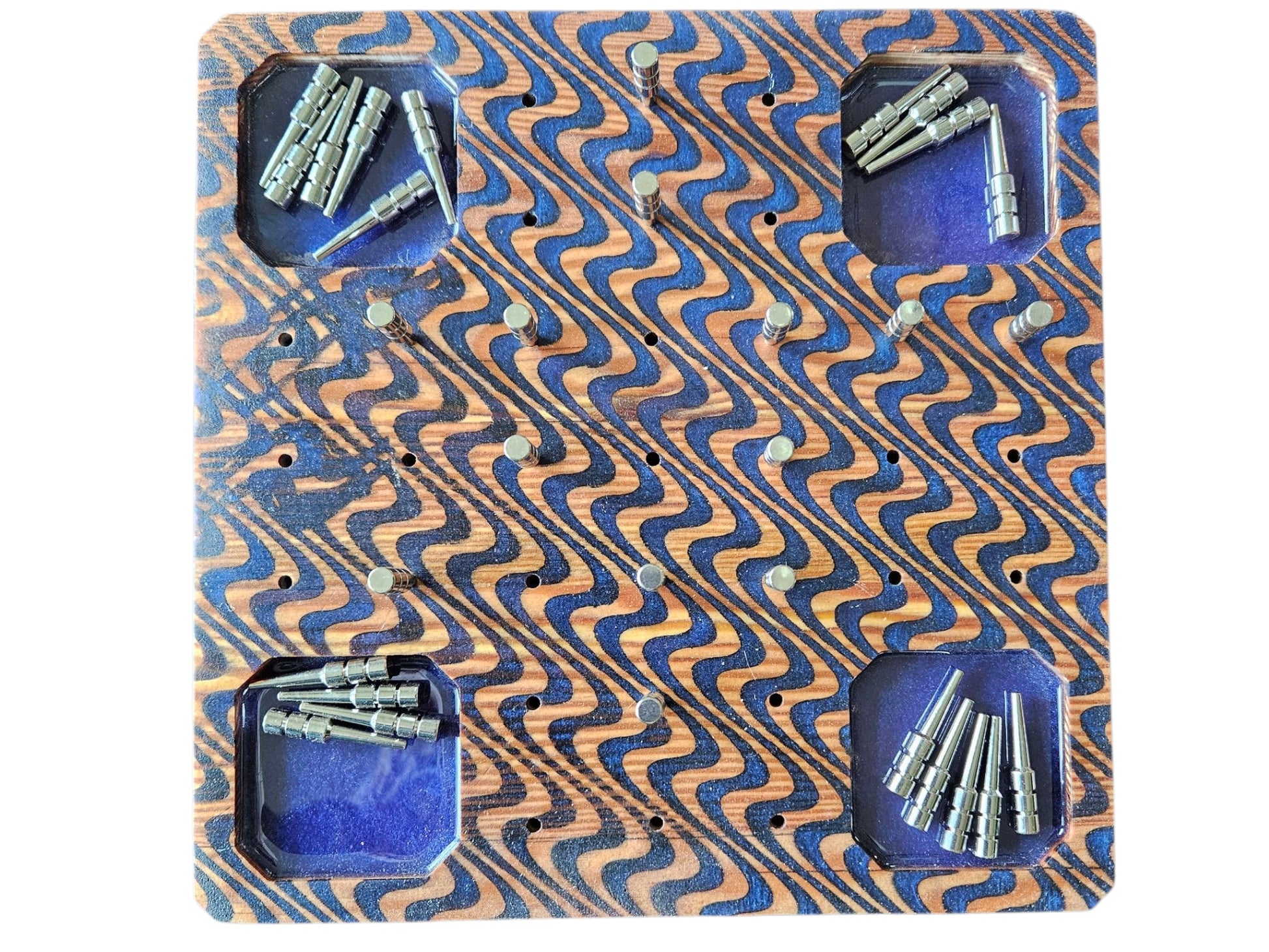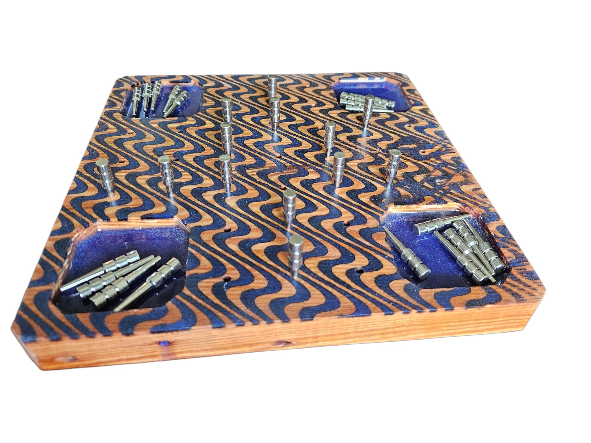 Bring timeless fun and strategy to your table with this Handcrafted Peg Board Game. Made from richly grained wood and accented with bold epoxy inlays, this unique game board is as much a piece of art as it is a source of entertainment. The flowing wave-like pattern adds a modern, eye-catching design, while the deep epoxy pockets provide storage for the sturdy metal pegs when not in use.
