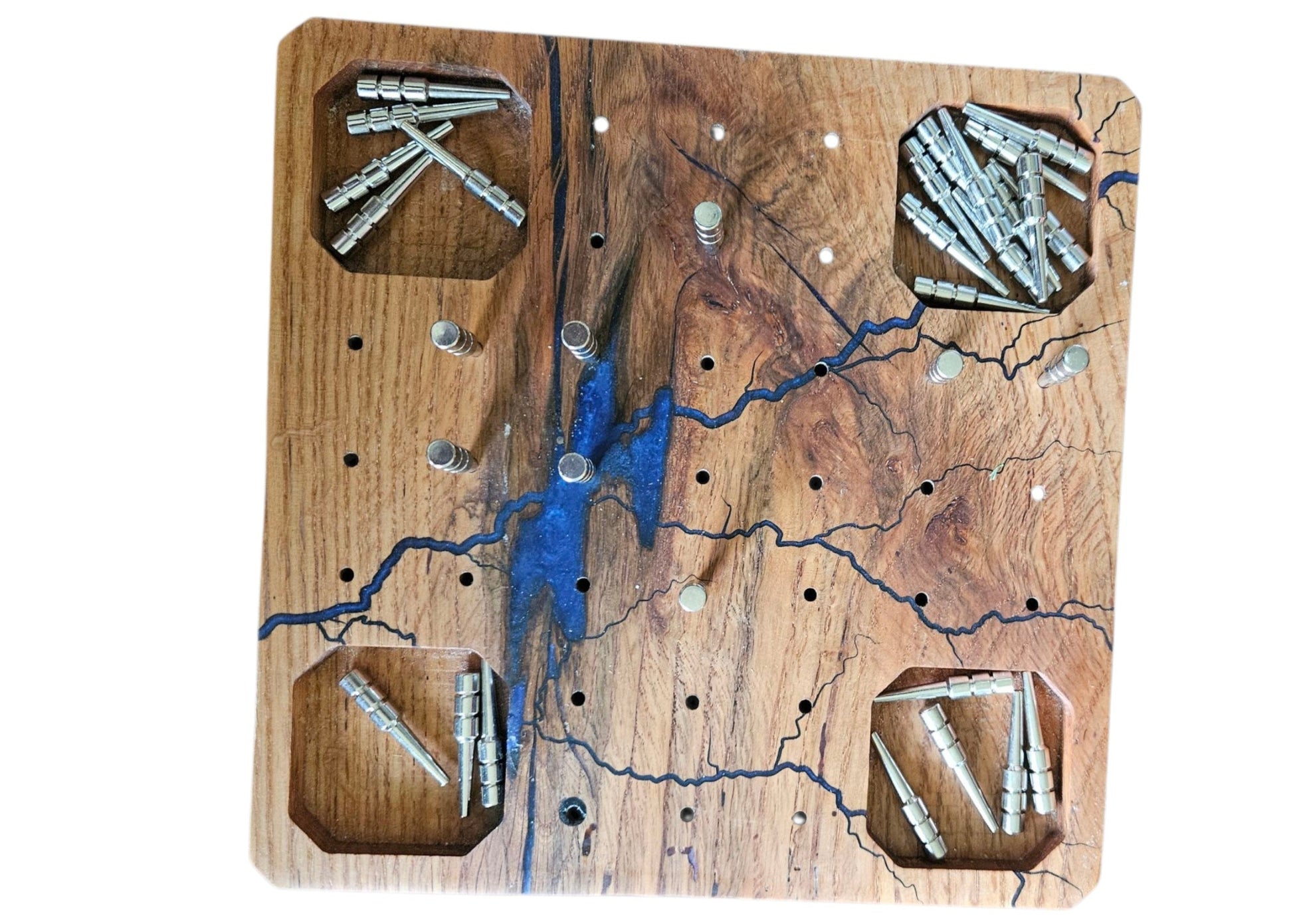 Bring timeless fun and strategy to your table with this Handcrafted Peg Board Game. Made from richly grained wood and accented with bold epoxy inlays, this unique game board is as much a piece of art as it is a source of entertainment. The flowing wave-like pattern adds a modern, eye-catching design, while the deep epoxy pockets provide storage for the sturdy metal pegs when not in use.