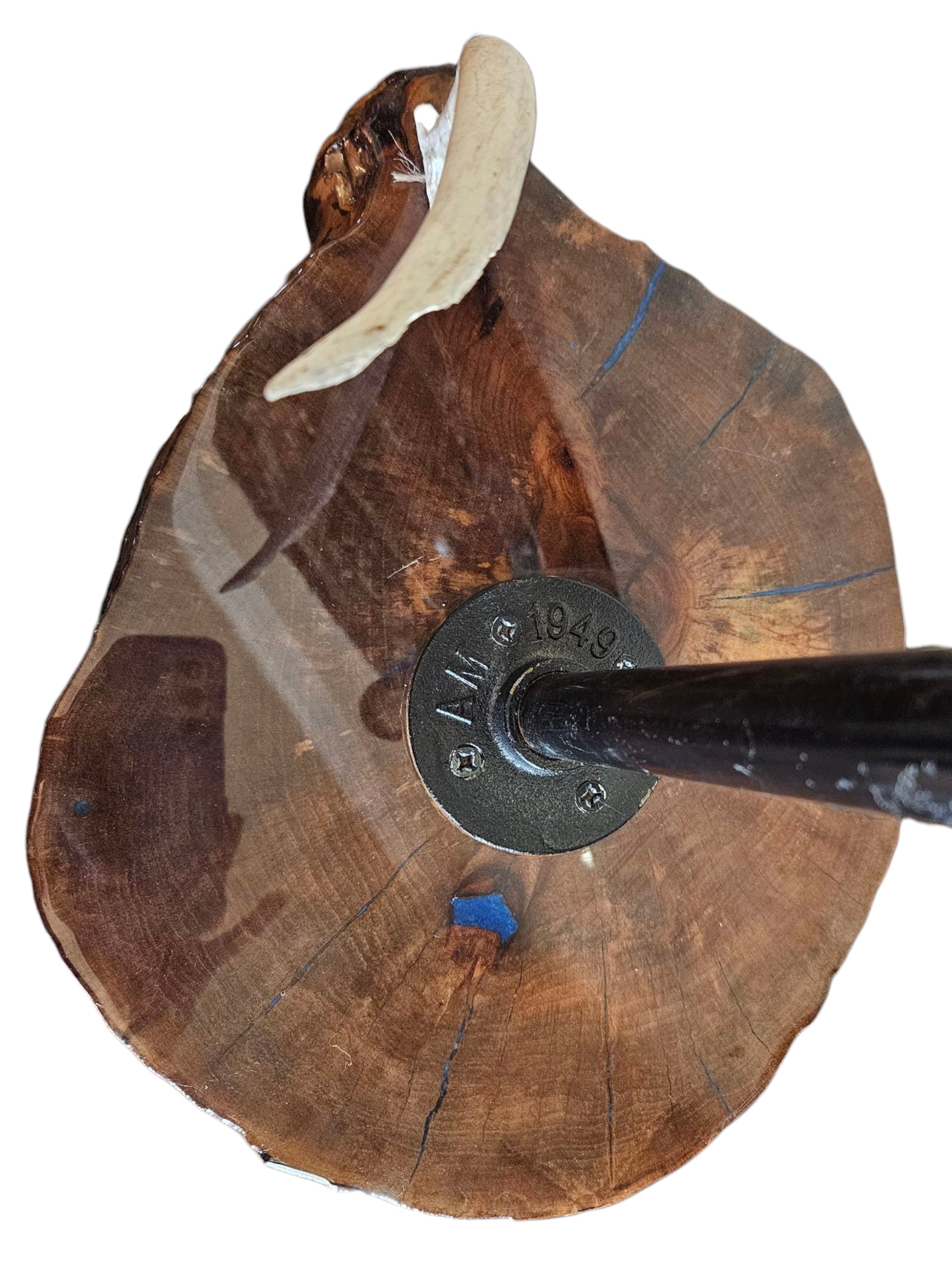 Rustic charm meets functional design with this one-of-a-kind paper towel holder. The base is made from a natural pecan cookie slab, showcasing rich grain patterns and live edge beauty, finished with a smooth, glossy seal. A sturdy black metal rod securely holds standard paper towel rolls, while a genuine antler accent adds a unique, nature-inspired touch. At 12 inches tall, this piece blends practicality with artistry, making it a standout addition to any farmhouse, cabin, or rustic-style kitchen.