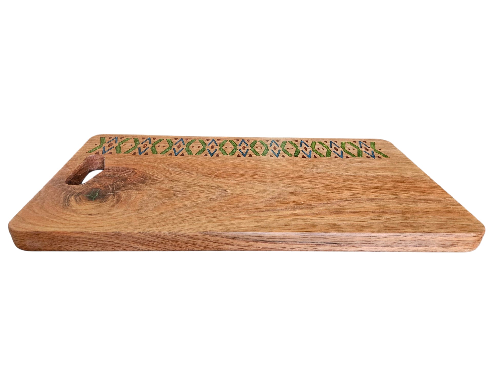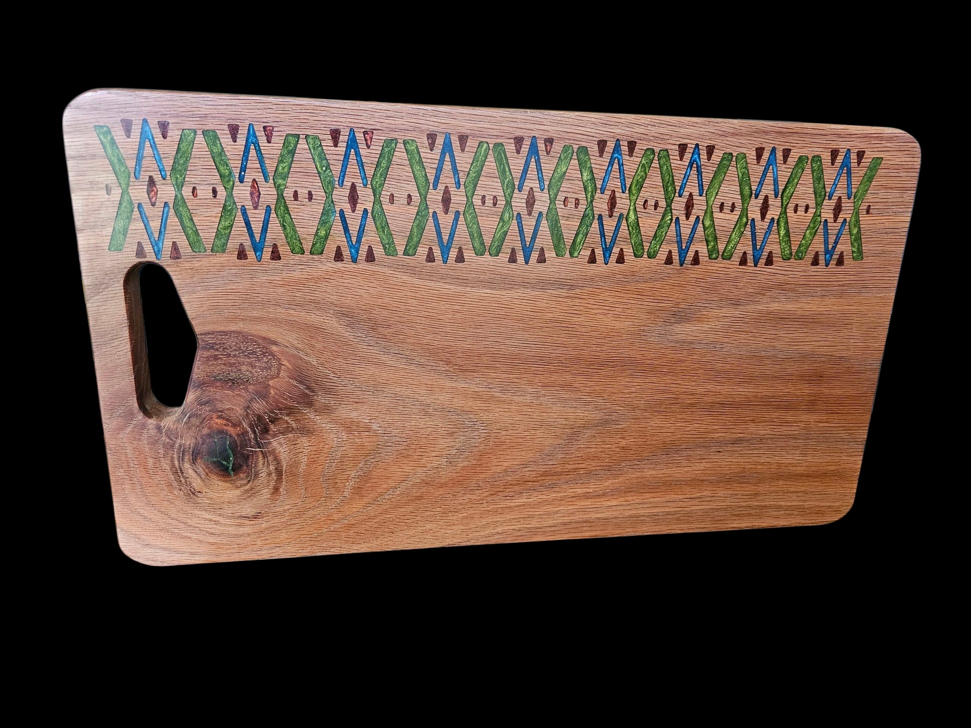 Bring style and functionality to your gatherings with this handcrafted Pecan Wood Serving Tray, measuring 19" x 10". The rich pecan grain is highlighted by a bold Aztec-inspired inlay of green, blue, and earthy tones, giving the tray a unique artistic character.