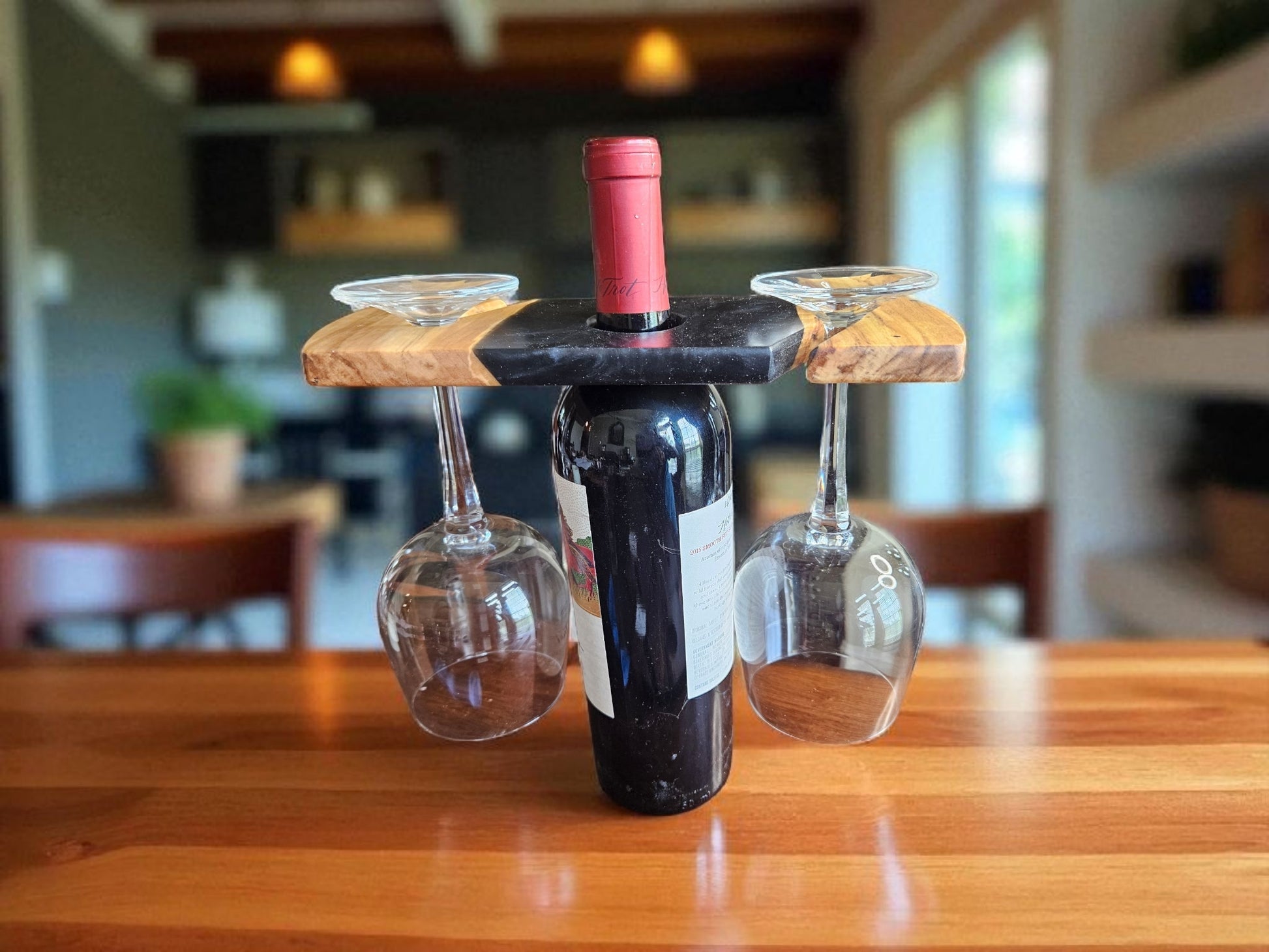 Elevate your wine nights with this Pecan and Black Wine Caddy, a perfect blend of rustic wood and sleek modern design. Handcrafted from richly grained pecan wood and accented with deep black epoxy, this caddy is designed to sit elegantly atop a wine bottle, holding two glasses for easy serving and display.